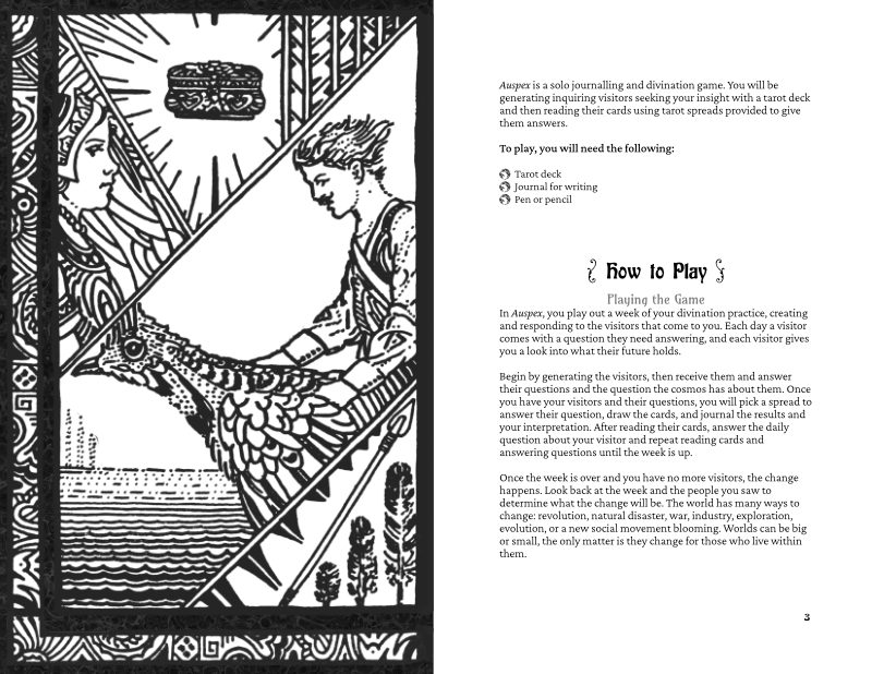 Auspex is a tarot based solo journalling game of world building and divination. Build your world: small, complicated, and about to change, and those that inhabit it that seek out your gifts. Using esoteric tarot spreads you will answer their questions and help shape the future of the world to come.
